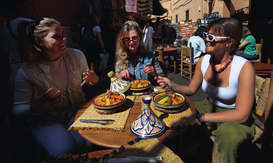 Auch kulinarisch ist Marokko ein Fest für die Sinne. Die Küche fusioniert arabische, berberische und europäische Traditionen zu einem intensiven Erlebnis aus Schmorgerichten, Couscous, Trockenfrüchten und Gebäck. Legendär ist die Teekultur, die hier mit einer Hingabe zelebriert wird, die ihresgleichen sucht. Das Herzstück der Mahlzeiten ist oft die Tajine, bei der Zutaten im charakteristischen Tontopf langsam über dem Feuer garen. Doch beim Essen geht es um mehr als Genuss – es geht um Gemeinschaft.